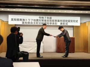 令和7年2月に行われた認定証交付式および高知県自主防災組織知事表彰の表彰式に出席し、認定証の交付を受けました。