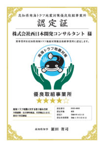 このたび、弊社 西日本開発コンサルタントは、高知県が実施する令和7年度「南海トラフ地震対策優良取組事業所」認定制度において、5つ星中4つ星の評価をいただき、優良取組事業所として認定されました。